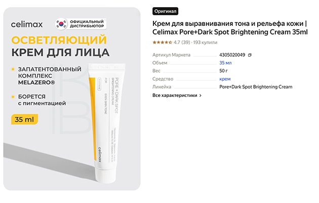 В состав также входят аскорбиновая (осветляет, тонизирует и омолаживает) и транексамовая кислоты. Последняя осветляет, выравнивает тон, препятствует повторному появлению гиперпигментации и стимулирует выработку собственного коллагена. Керамид NP увлажняет, предотвращает потерю влаги, восстанавливает и укрепляет защитный слой кожи. Крем содержит PDRN (полидезоксирибонуклеотид) — вещество, которое добывают из ДНК рыб. Его назначение — омоложение и регенерация.