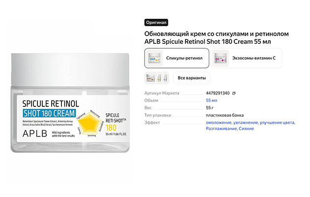 А вот это уже крем: обновляющий состав со спикулами и ретинолом Spicule Retinol Shot 180 Cream. Производитель — корейская косметическая компания APLB.