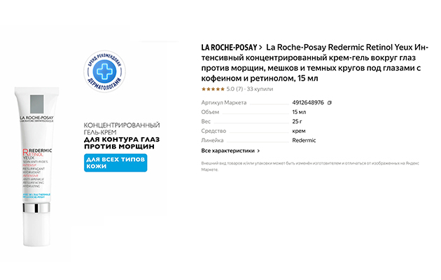 В составе две формы ретинола, бережные для барьера кожи. Также есть кофеин против отеков и аденозин против старения. Последний участвует в синтезе АТФ, благодаря которой кожа быстрее регенерируется и восстанавливается после повреждений. Еще крем содержит силиконы. Уходовую функцию они не выполняют, зато визуально разглаживает морщины.