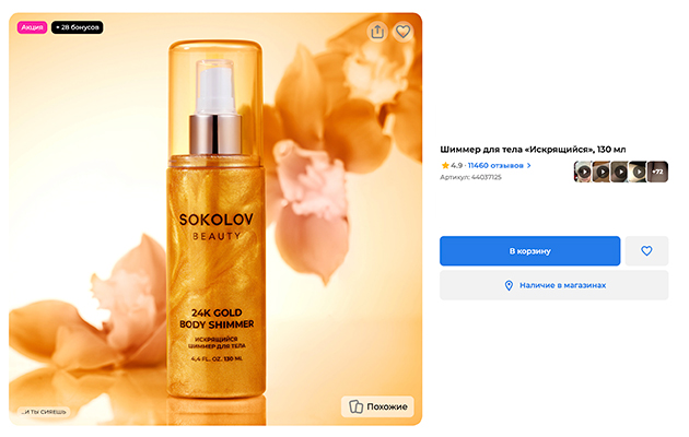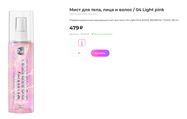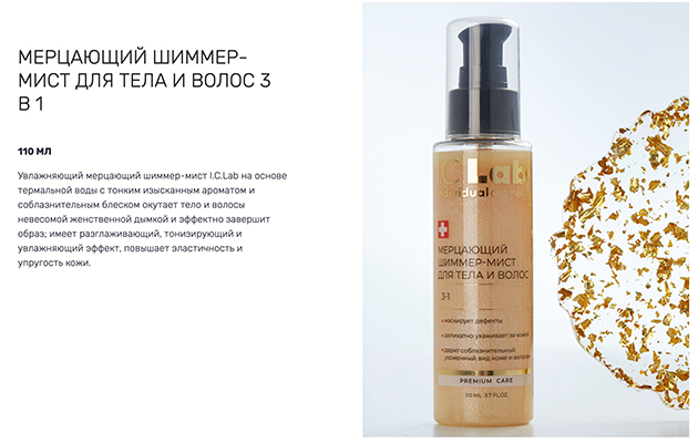 Универсальный мист, который можно использовать для тела, лица и волос. По заявлениям производителя отличается эффектным мерцающим сиянием и выразительным ароматом. Спрей увлажняет кожу и волосы, придает им ухоженный вид и деликатно подсвечивает за счет голографических частиц. Подходит для ежедневного использования, особенно в периоды, когда коже не хватает увлажнения (актуально в период работы кондиционеров и отопительных приборов).