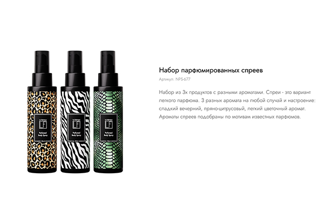 Набор из трех парфюмированных спреев для тела — удачный вариант, если вам нравится менять ароматы в зависимости от настроения и ситуации. Каждый спрей мягко раскрывается на коже и подходит для повседневного использования. Ароматы звучат для многих узнаваемо (некоторые отмечают, что слышат в них нотки узнаваемых композиций, для каждого они свои) и гармонично.