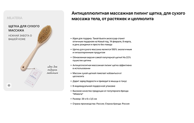 Правильная щетка для сухого массажа — это еще не все. Нужно уметь ею пользоваться — к счастью, щетки поставляются с пошаговой инструкцией. Массажер Milateria разработан специально для сглаживания проявлений целлюлита и поддержания здоровой кожи. Щетка изготовлена из щетины кабана средней жесткости и алтайской березы — подходит для отшелушивания и глубокого массажа. Такой подход усиливает кровообращение, ускоряет процесс обновления клеток и помогает избавиться от застоев жидкости в тканях. Удобная конструкция ручки облегчает использование, обеспечивая равномерное распределение давления и максимальную эффективность каждой процедуры. Щетка претерпела изменения — теперь ее щетина стала пышнее на 22%, и это большой плюс. Натуральные компоненты гарантируют безопасность и комфорт при частом применении.