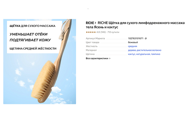 Щетка для сухого лимфодренажного массажа RICHE создана специально для тела. Щетина выполнена из мексиканского кактуса, а корпус из древесины ясеня. Как часто пользоваться щеткой для сухого массажа? Достаточно начать с трех минут в день, плавно увеличивая продолжительность. Во время массажа может возникнуть чувство жжения или раздражения — в этом случае лучше сократить время процедуры и уменьшить силу давления. Щетка выполняет сразу несколько функций: уменьшает отеки и видимость «апельсиновой корки», усиливает эффективность кремов и масел. Подходит для нормальной/сухой/проблемной кожи. Пользователи отмечают качество щетки, удобство использования и приятные ощущения во время массажа. Поставляется в мешочке с информацией о массажных линиях, что определенно плюс для новичков.