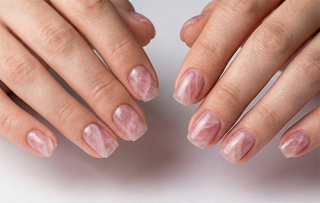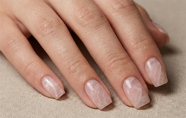 Прозрачный кварц обещает стать супертрендом осени 2026 года. Причем этот тот вариант, который хорошо будет смотреться как на руках школьниц, так и студенток. Полупрозрачное покрытие молочно-розового оттенка, слегка «затуманенное» изнутри, с едва заметными прожилками, выглядит необычно и свежо. Несомненный плюс такого маникюра — универсальность. Ногти с эффектом кварца будут выглядеть уместно как на празднике, так и на уроках.