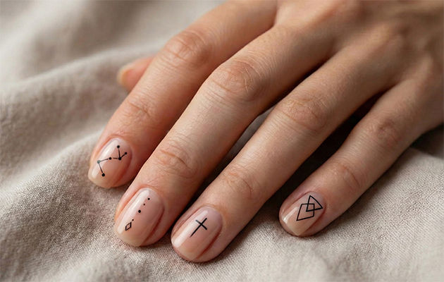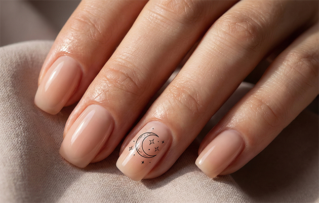 Это такое баловство, но очень милое, которое как бы намекает, что даже отличница в душе может быть бунтаркой. Татуаж на ногтях добавляют даже самому классическому маникюру нужную изюминку, но при этом не будет выглядеть вызывающим. Тем более, что сделать «татуировку на ногтях» можно даже в домашних условиях. Достаточно нанести базовую телесную основу, и на нее приклеить покупную наклейку-слайдер или небольшую вырезку из газет-журналов. На ногтях будут хорошо смотреться и самые простые геометрические фигуры: сердца, кристаллы, кресты, луна, солнце, звезды и созвездия. Сверху можно закрепить прозрачным лаком.
