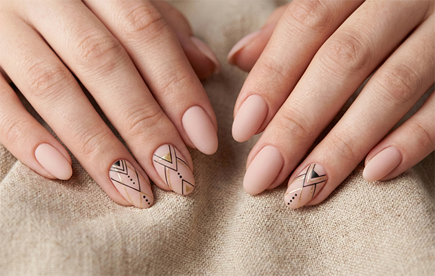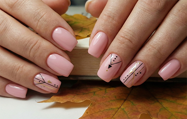 - Сверху покройте ногти нежно-розовым или бежевым лаком.
