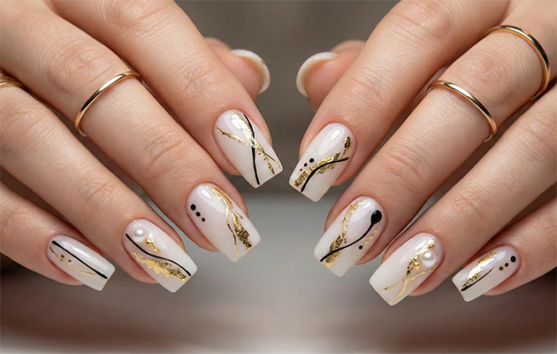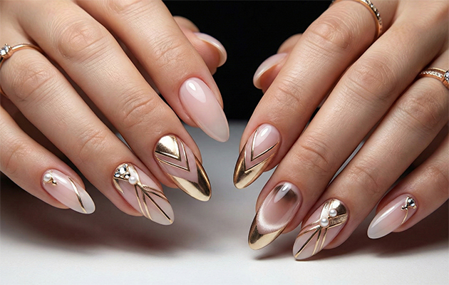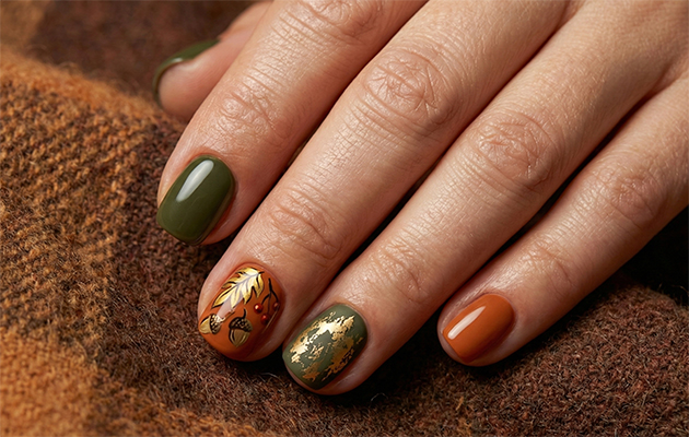 Очень актуальны жемчужные втирки, дающие деликатное сатиновое свечение. Для дизайна подойдут утонченные элементы с золотой поталью, символизирующей осеннюю листву, или минималистичные ботанические узоры в теплых тонах.