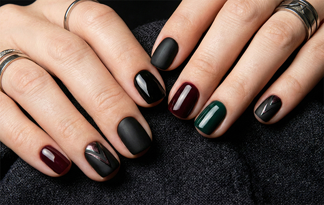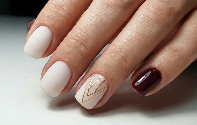 Классические красно-бордовые, темно-синие и болотно-зеленые оттенки будут отлично сочетаться с нежными бежевыми и молочными оттенками. Такой контраст создаст стильный и элегантный образ, а маникюр в нюдовой гамме можно будет разнообразить более интересными акцентами.