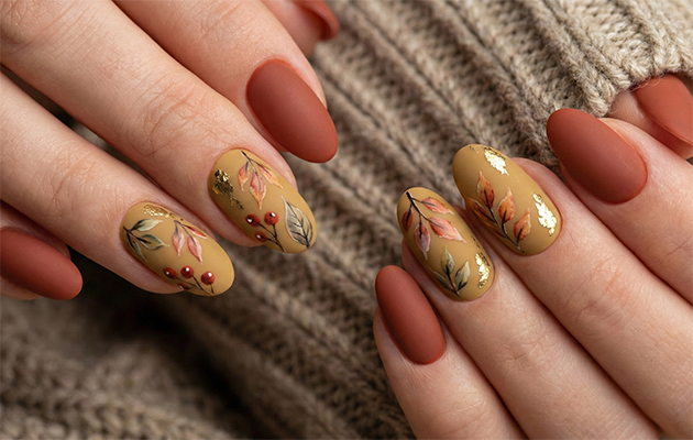 Дизайн маникюра может быть самым разным. Но в основном выделяют три тренда. Первый — сдержанный монохром. Однотонный маникюр на осень 2026 года будет выигрышно смотреться, если подобрать подходящий цвет. Второй тренд — минималистичный дизайн. Как правило, выбирают простые фигуры или небольшие изображения, связанные с осенью: например, листья. Третий тренд — покрытия с необычными дизайнами. Активно набирают популярность фактурные покрытия: бархатный эффект, сатин, «кошачий глаз» в темных тонах4.