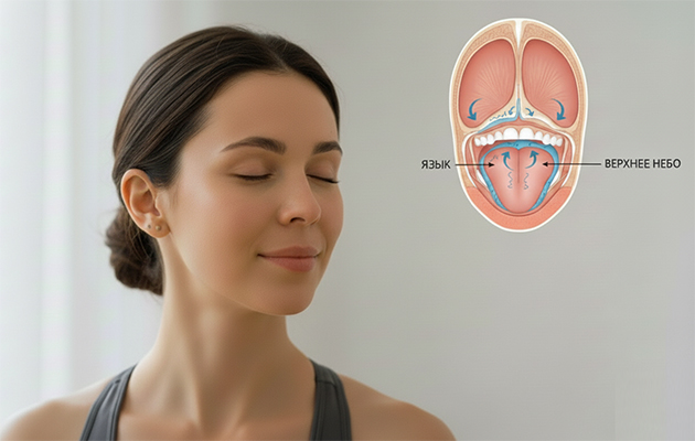 Таким образом повторяем несколько вдохов-выдохов. Сильно давить языком тоже не нужно, достаточно лишь прикладывать треть усилий.