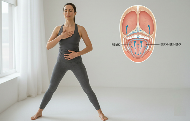 - Делаем вдох и давим языком на верхнее небо. В этот момент расслабленный живот надувается, а грудная клетка расширяется.