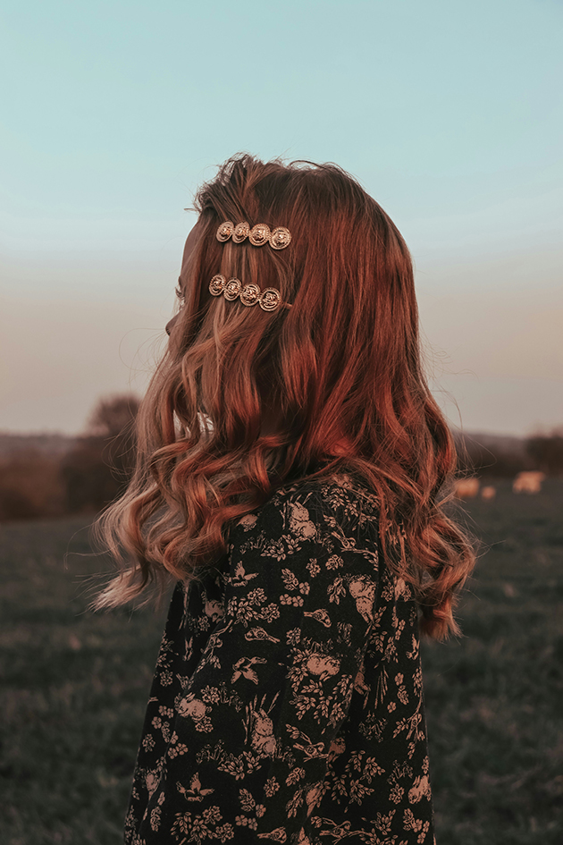 Закрытое платье с длиной ниже колена — волосы забираем наверх, надеваем более крупные акцентные клипсы из массивного металла для привлечения внимания к шее.