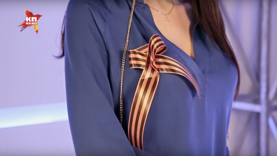 Сложите Георгиевскую ленту так, чтобы получилась буква «М» и прикрепите к одежде двумя булавками. Для этого сложите ее вчетверо, а затем верхний конец растяните вправо, а нижний — влево. Получится символ мая месяца.