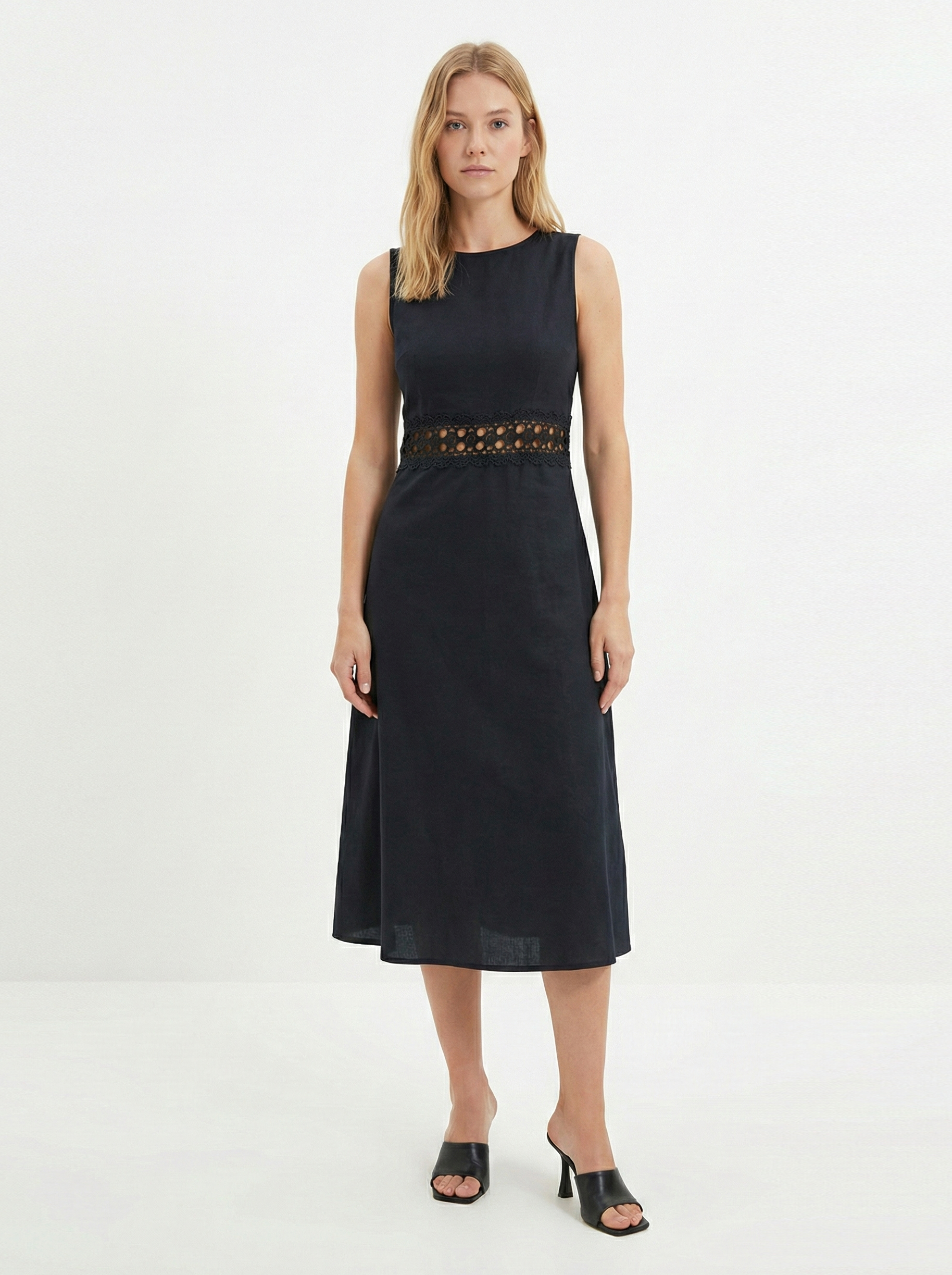Сейчас идет тренд на экологичность материалов, поэтому лен с хлопком — то, что надо. Ткани плотно держат форму, не мнутся и выглядят просто восхитительно! Летом такое сочетание позволит легко перенести жару. Оливковый, пудрово-розовый, нежно-белый, молочный — актуальные цвета. Длина платья — миди или чуть выше колена, широкий пояс из той же ткани.
