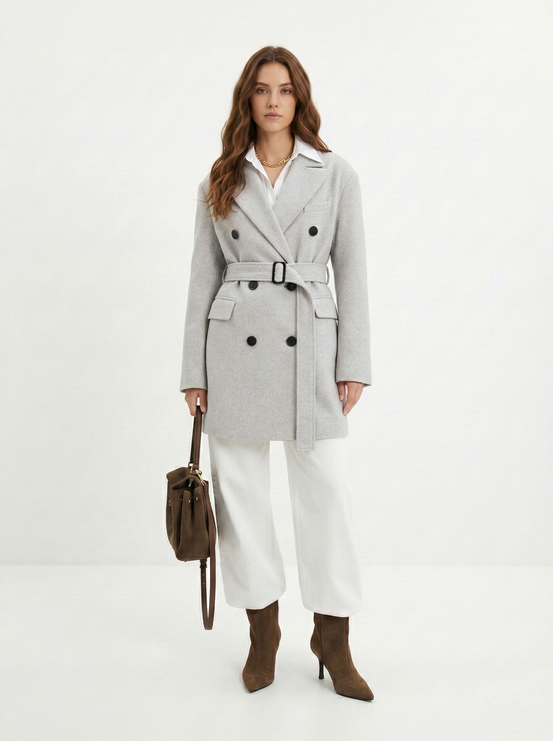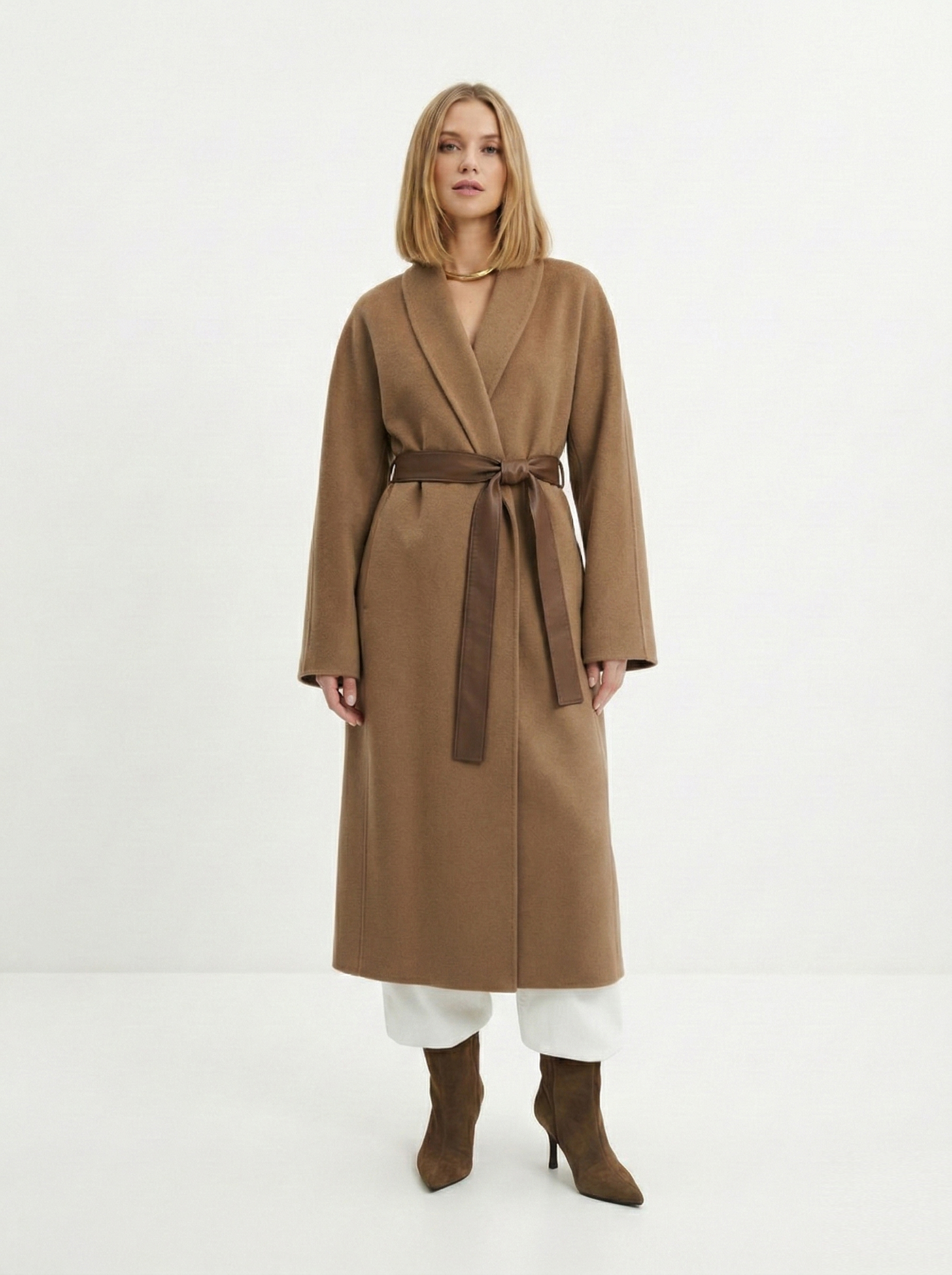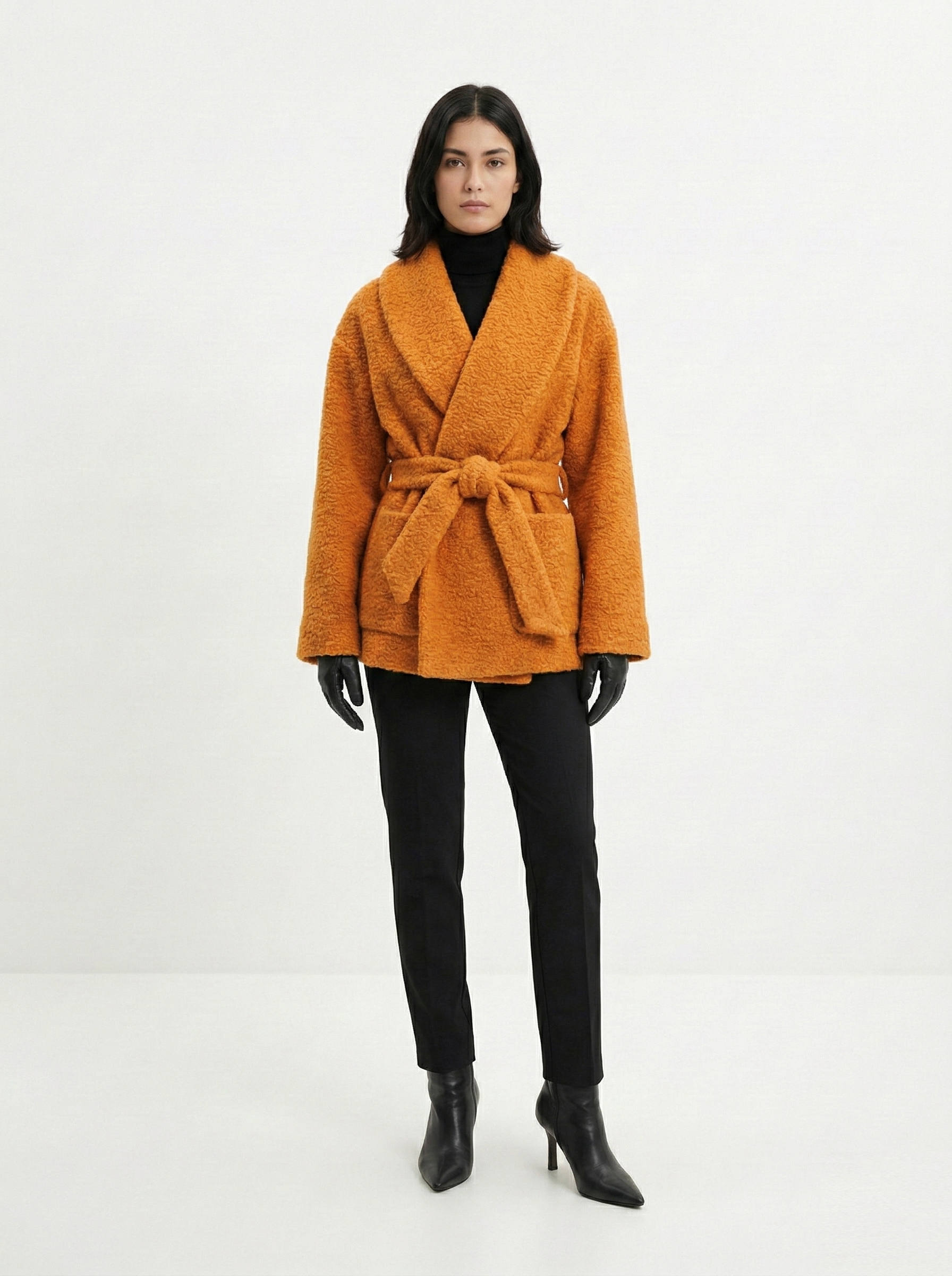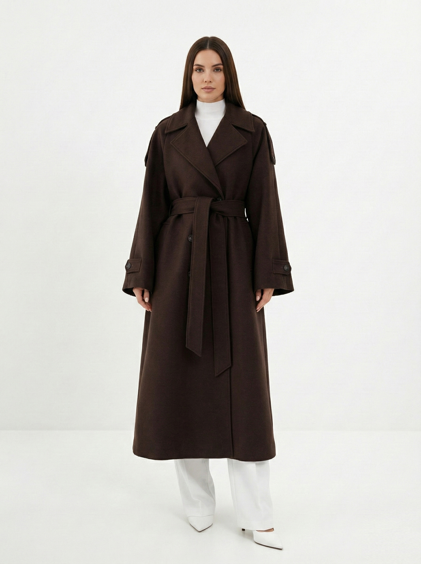 - Прямоугольник: приталенные пальто, модели с поясом. Избегайте оверсайза и акцентного верха.