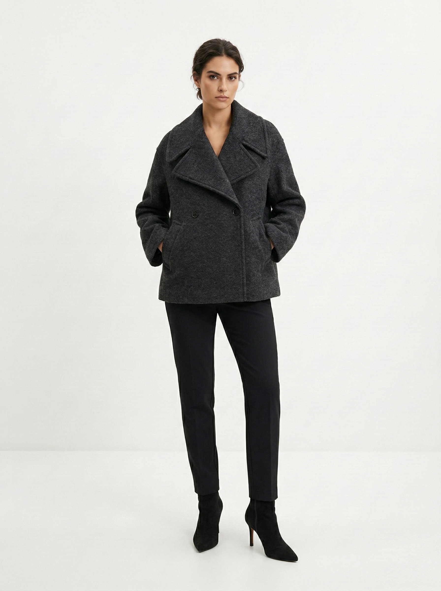 - Груша: двубортные пальто, А-силуэт, широкие плечи, лацканы. Избегайте акцентного низа.