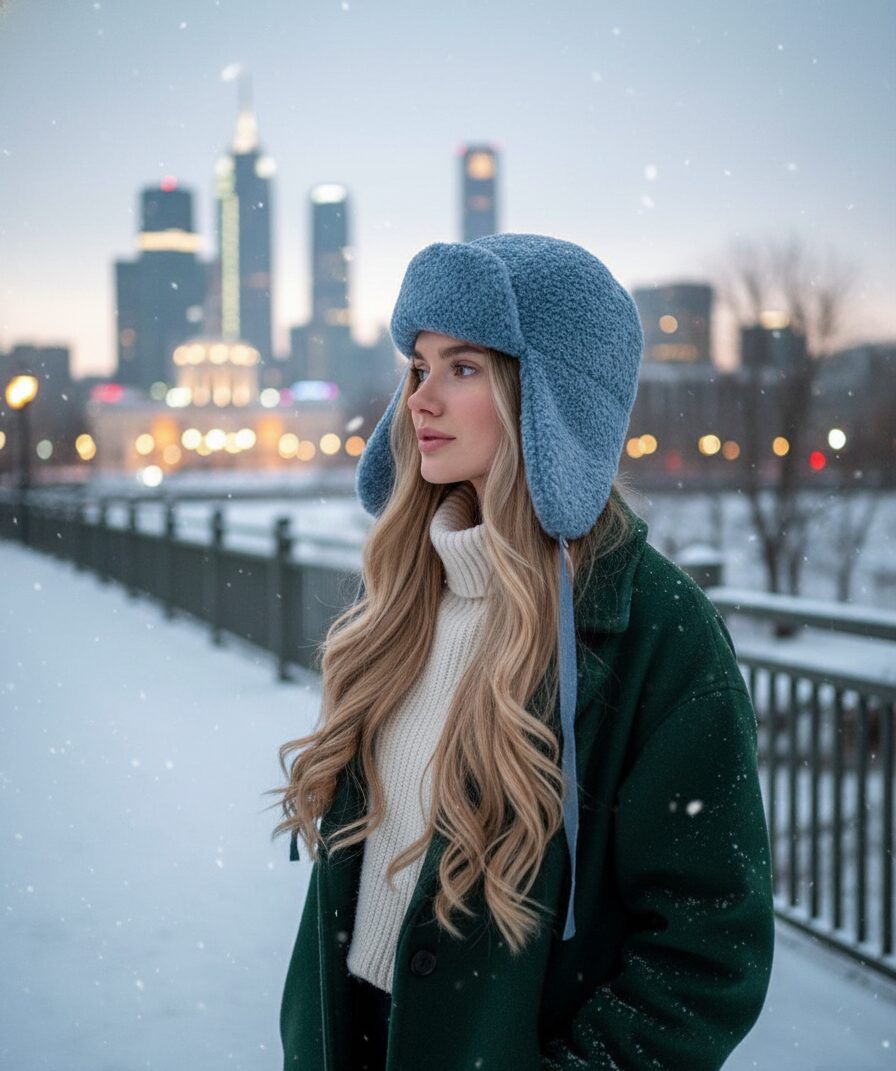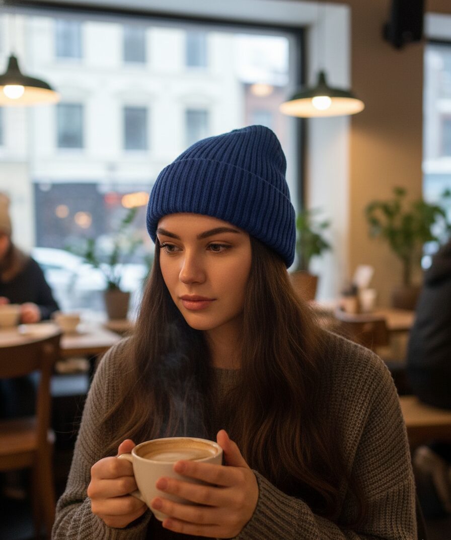 - Акценты. Если весь образ в спокойных тонах, используйте шапку как акцент — например, в ярком синем, бордовом или насыщенно-зеленом цвете.