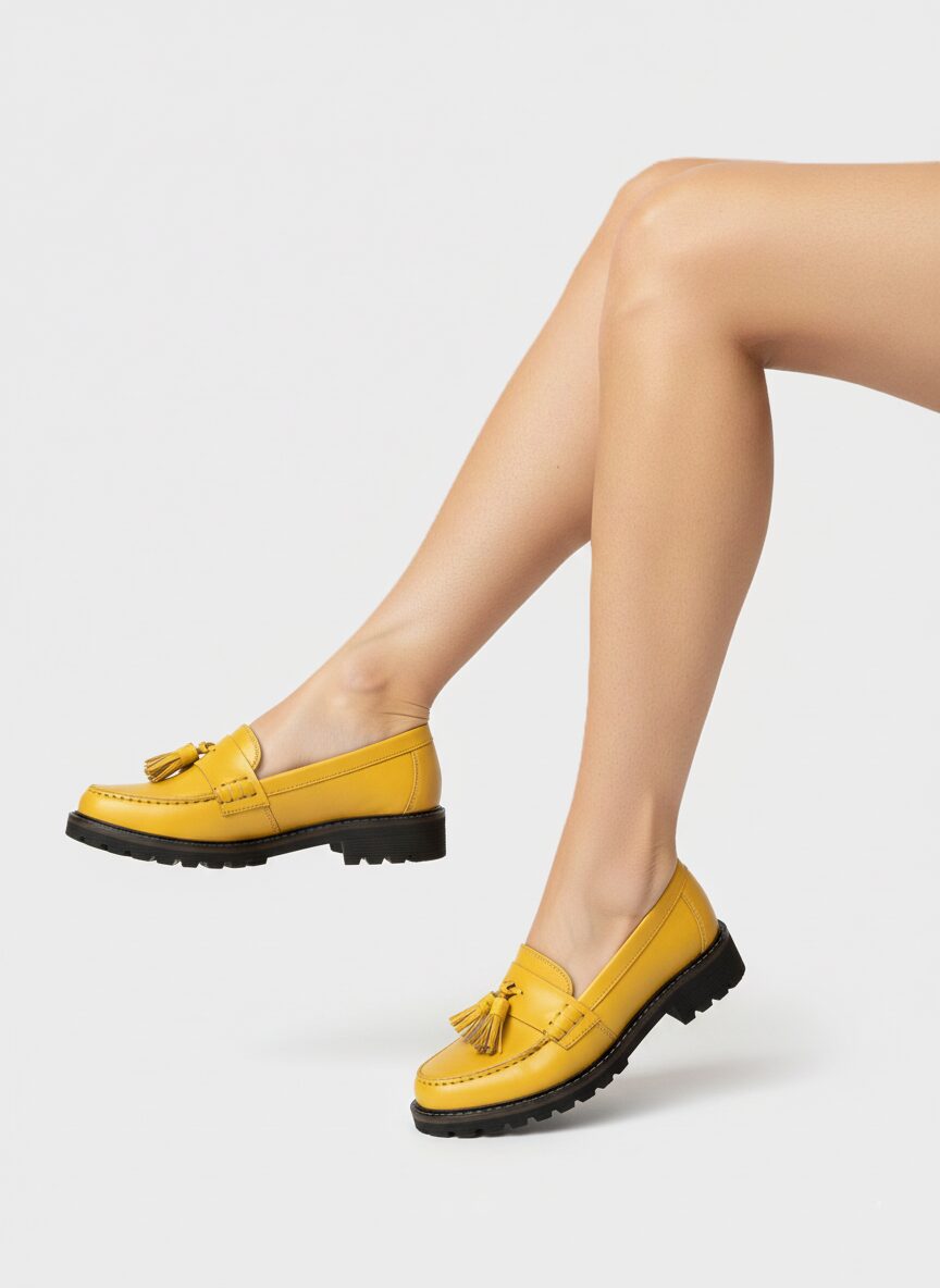 В осенних образах уместны более закрытые модели туфель. Универсальный вариант — классические лодочки или лоферы. В качестве стилистического приема можно надеть под них черные капроновые гольфы или белые хлопковые носки.