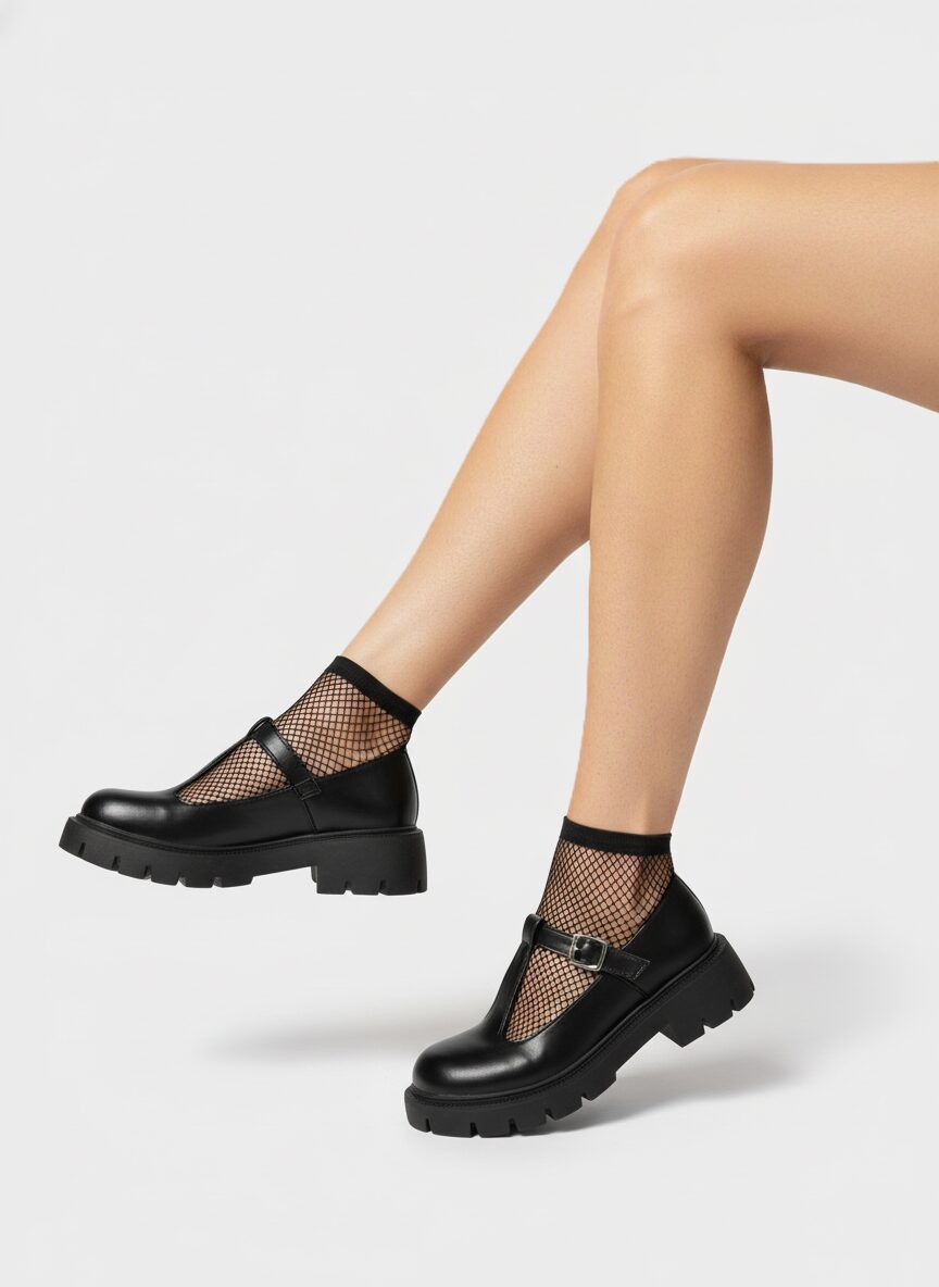 Одна из самых модных моделей туфель сейчас — Мэри Джейн. Это эдакий привет из прошлого, которым дизайнеры вдохновились и предложили более современную интерпретацию. Актуальны также туфли с большим количеством тонких перемычек.