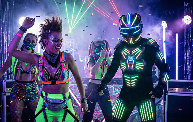 Среди типичных аксессуаров — очки с цветными линзами, браслеты из бисера, пластиковые бусы, светодиодные игрушки, светящиеся палочки и перчатки с подсветкой. Очень популярны рюкзаки небольших размеров с логотипами музыкальных фестивалей и диджеев.