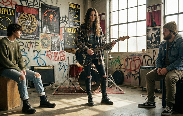 Гранж-движение бунтовало против навязанных обществом и культурой стандартов. Визуальные маркеры — простые свитеры крупной вязки, джинсы, кроссовки и рваные футболки — призваны подчеркнуть идею внутреннего комфорта через «отказ от показухи».