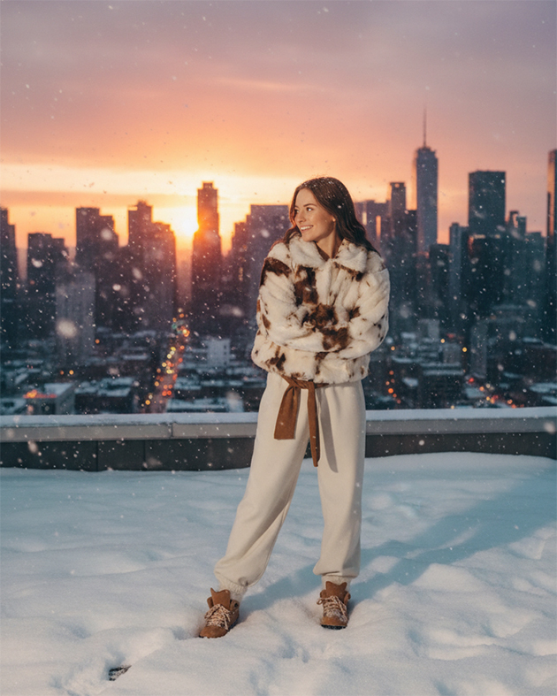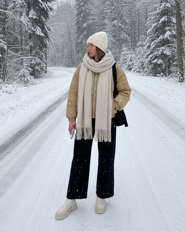 В качестве верхнего слоя выбираем пуховик и шерстяное пальто полной длины. Теплый свитер или водолазка с горлом помогут не замерзнуть даже в самую холодную погоду. Дополняем лук джинсами комфортного фасона или брюками из плотной ткани, желательно с добавлением шерсти или кашемира.