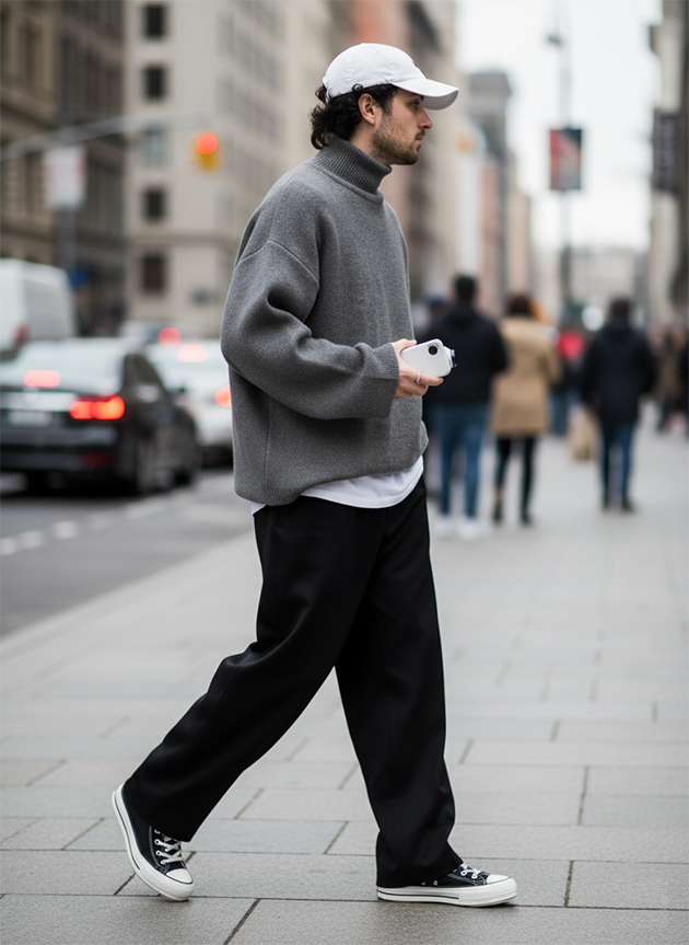 В нем нет флиса, спортивного джерси, карго и ярких вещей — вместо этого используются оксфорды высокого грейда, тонкая шерсть, fine merino, структурированные кардиганы, темный деним или чиносы.