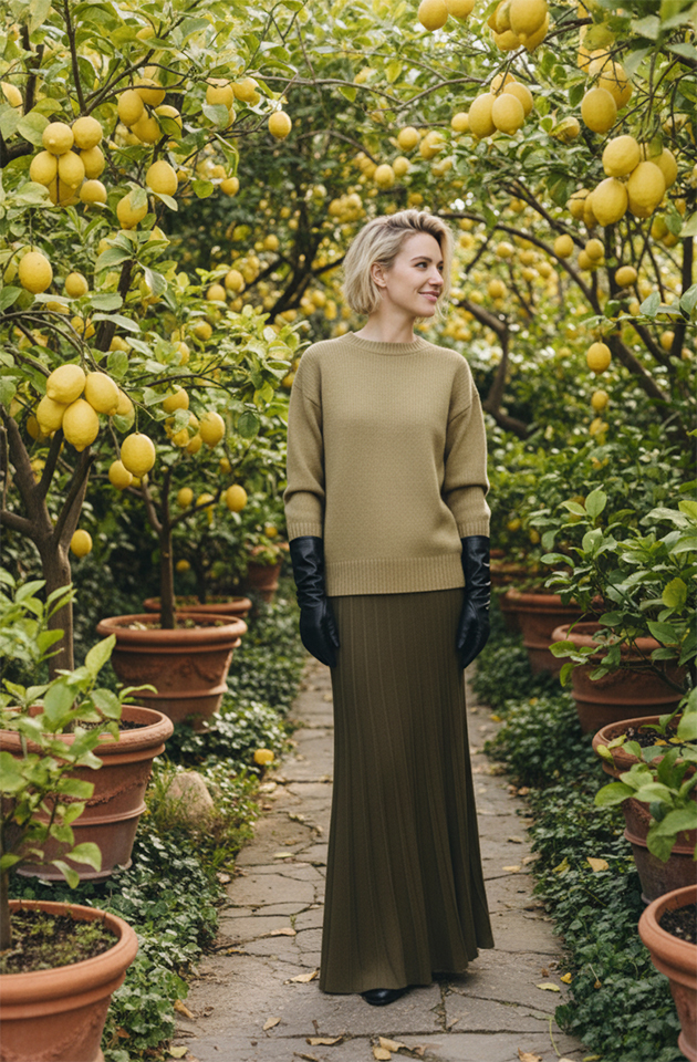 - Свитер: лучше обратить внимание на вариант из шерсти, кашемира или хлопка в нейтральном оттенке.