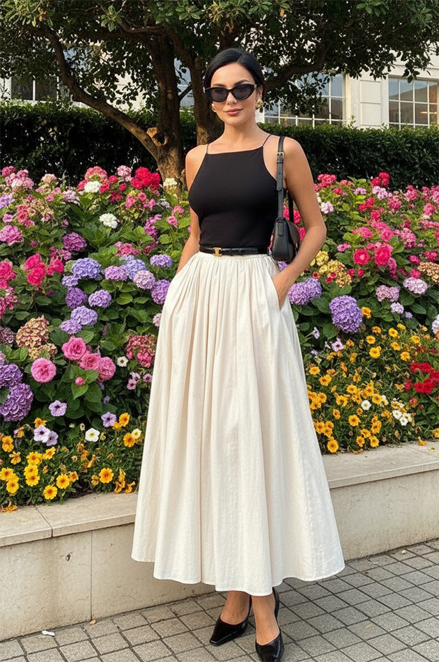• Лучший фасон — силуэт 50-х: акцент на талии, мягкий рукав ¾, плавная юбка-солнце.