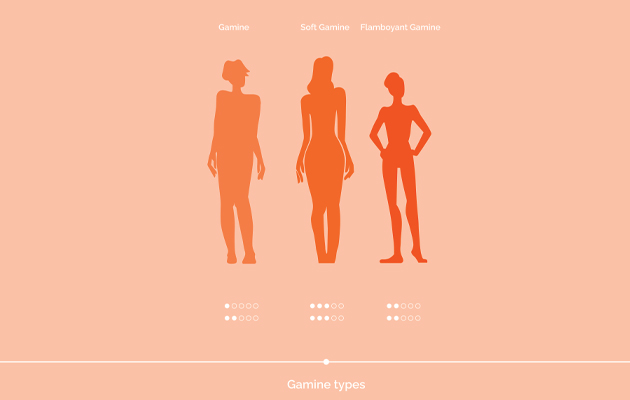 Внутри типажа выделяют несколько вариаций. Мягкий гамин сочетает угловатость гамина и заметную инь-округлость. Фигура остается компактной, но появляется мягкость форм: чуть более выраженная грудь, округлые бедра, более кукольные черты лица. Образ становится нежнее, но сохраняет игривость и динамику. Чистый гамин — наиболее сбалансированное сочетание инь и ян без сильного перевеса. Фигура прямая и легкая, черты лица контрастные: большие глаза, аккуратные скулы, четкая линия губ. Внешность выглядит ярко и графично, с выраженной индивидуальностью. Яркий гамин ближе всего к ян-компоненту. Более выраженная костная структура, резче линии тела, сильнее контраст черт лица. Такой типаж выглядит смелее, энергичнее и более модельным, легко держит нестандартные и экспериментальные образы.