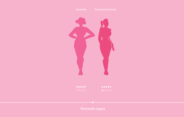 Внутри романтичного типа выделяют два ключевых варианта. Чистый романтик — это максимально мягкий и цельный вариант типажа. Внешность полностью строится на округлостях: лицо очень нежное, с плавными линиями, фигура выражено песочные часы, без намека на угловатость. Даже при изменении веса пропорции остаются гармоничными, тело сохраняет мягкую форму, без резких переходов. Театральный романтик — более выразительный и контрастный вариант. В нем сохраняется мягкая база, но добавляется острота или драматичность в деталях внешности. Это может проявляться в чуть более выраженных скулах, более заметных чертах лица или визуальной энергии во взгляде. Фигура при этом остается женственной.