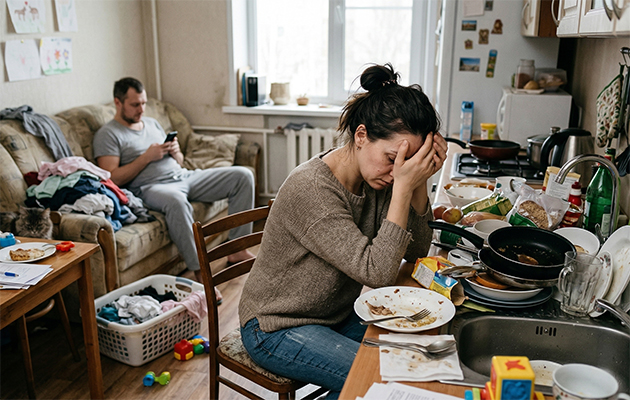 В семье с двумя детьми права и желания женщины постоянно ущемляются. Мать работает полный рабочий день и полностью обеспечивает быт. Ее муж уверен, что домашние обязанности — исключительно женская работа, и не принимает в них никакого участия. Он часто критикует супругу за то, что она не успевает постирать, погладить или сделать уборку, несмотря на то, что жена вкладывается в семейный бюджет наравне с ним.