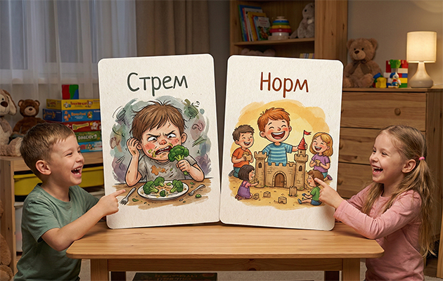 Между детьми и родителями однозначно существуют границы, тем не менее, мама с папой не должны стоять на недосягаемом пьедестале. Отлично, если ребенок не боится обратиться к ним за советом, поделиться радостью или проблемой. Для этого родители должны стать ему ближе и понятнее — в этом поможет игра «Стрем или норм».