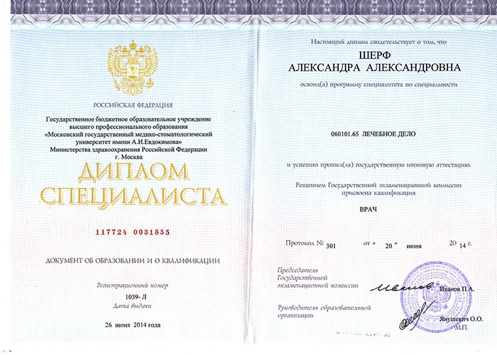 В 2014 году закончила Московский государственный медико-стоматологический университет Евдокимова «Лечебное дело».