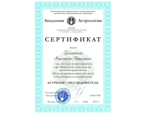 - Прошла полный курс обучения в Московской Академии Астрологии им. М. Б. Левина.
