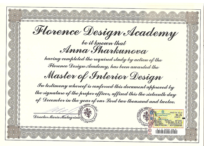 Высшее профессиональное образование: курс Master в Florence Design Academy (Италия).