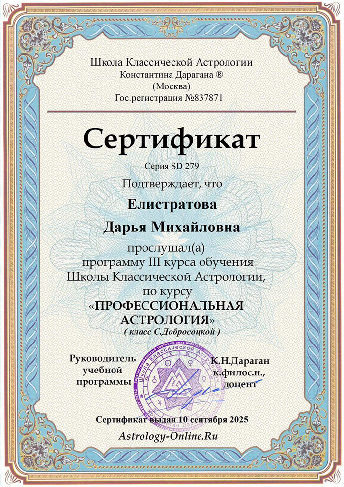 Западный астролог, выпускница школы классической астрологии Константина Дарагана, слушатель курсов Павла Андреева.