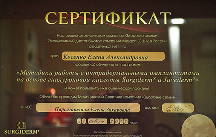 2005 г. Закончила медицинскую Академию им. И. И. Мечникова по специальности «Лечебное дело». Получила специализацию в клинической ординатуре по Дерматовенерологии и повысила квалификацию в высшем учебном заведении по направлению: врач-косметолог.