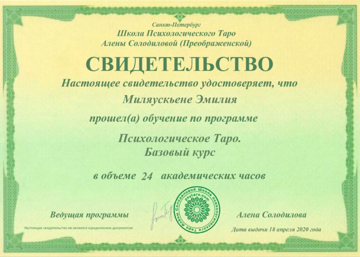 В 2019 году начинает заниматься в качестве хобби картами Таро, вовлеченность в которые перерастает в нечто большее. Первые шаги проходили под наставничеством Патрисии Асебо и Расы Сауле, далее последовало обучение в сфере Психологического Таро и расстановок Алены Солодиловой и, наконец, обучение на «Мастера луча» в школе «Врата Изиды».