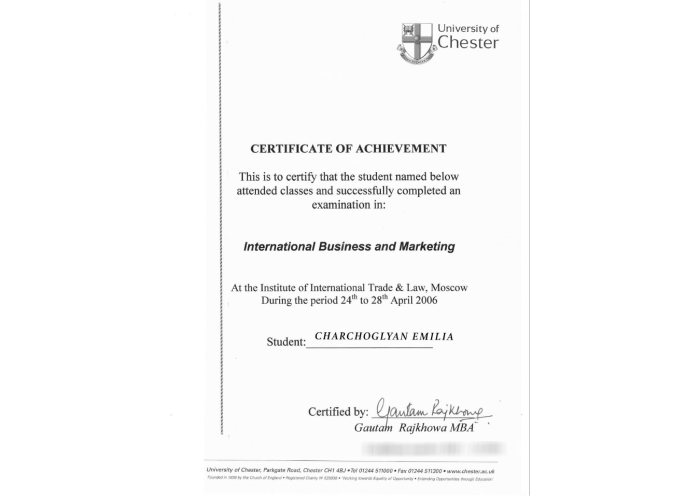 Окончила институт при Академии внешней торговли по специализации «Менеджмент и экономика».