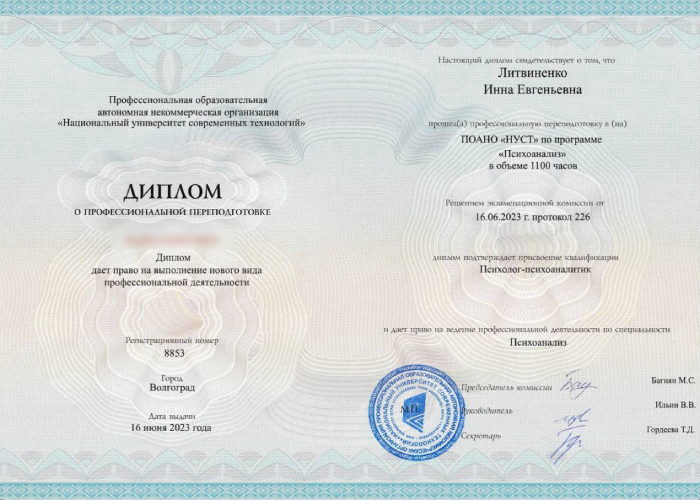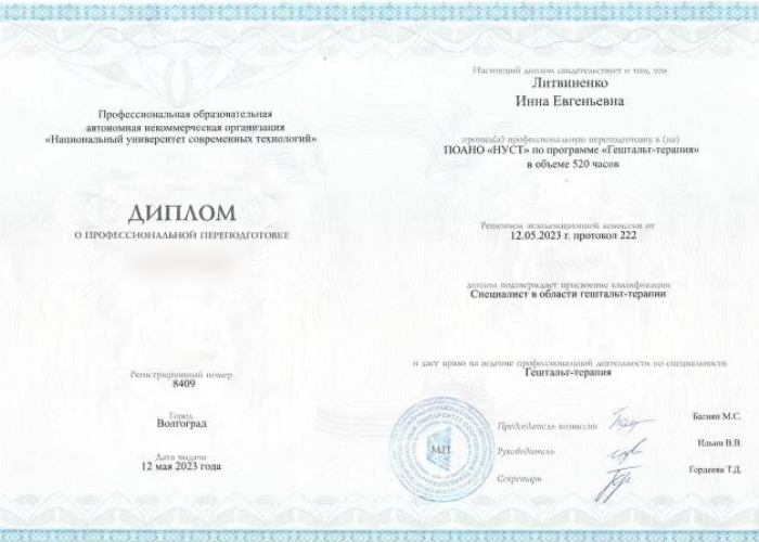 • Национальный университет современных технологий. «Гештальт-терапия» с присвоением квалификации «Специалист в области гештальт-терапии»; «Психоанализ» с присвоением квалификации «Психолог-психоаналитик».