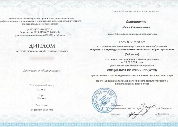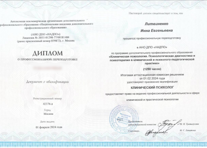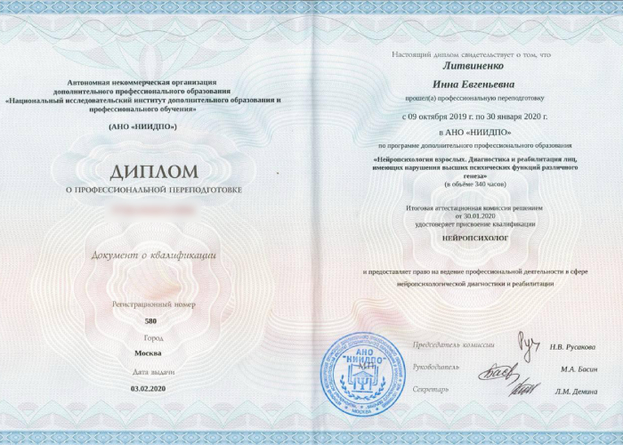 • Национальный исследовательский институт дополнительного образования и профессионального обучения. «Экстремальная психология. Оказание экстренной помощи в кризисных ситуациях и при психологических травмах» с присвоением квалификации «Кризисный психолог»; «Нейропсихология взрослых. Диагностика и реабилитация лиц, имеющих нарушения высших психических функций различного генеза» с присвоением квалификации «Нейропсихолог».