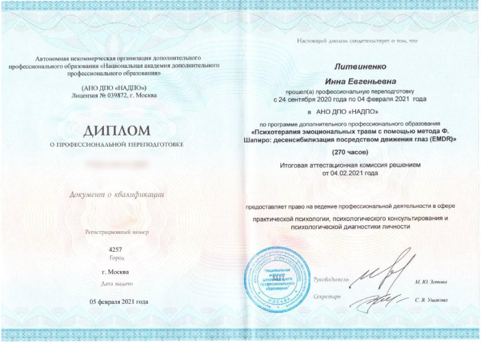 • Национальный исследовательский институт дополнительного образования и профессионального обучения. «Методы психокоррекционной работы с паническими атаками»; «Посттравматическое стрессовое расстройство (ПТСР). Особенности психотерапевтической работы со взрослыми».