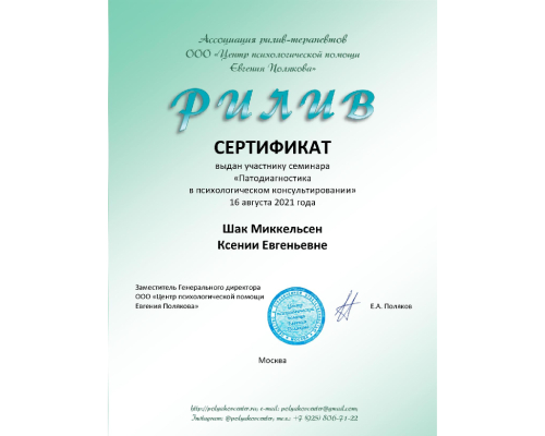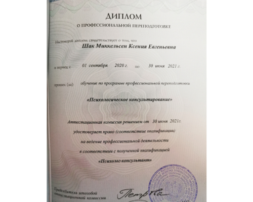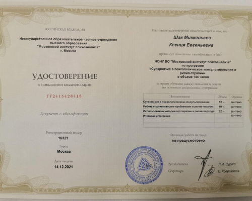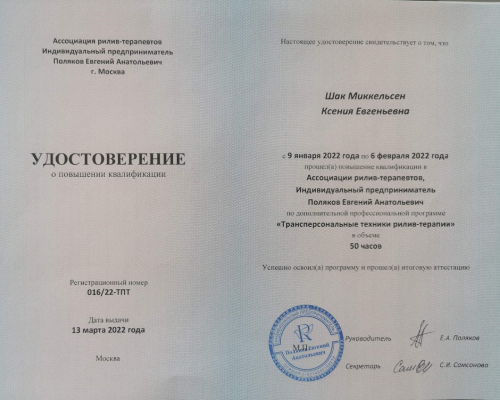 Окончила РГСУ по специальности «Психология», прошла курс обучения «Рилив-терапия» и «Трансперсональная терапия» с 2020 по 2023 годы. В настоящее время заканчиваю обучение в Магистратуре МИП (Московского Института Психоанализа) по профилю прикладного психоанализа и психоаналитического консультирования.