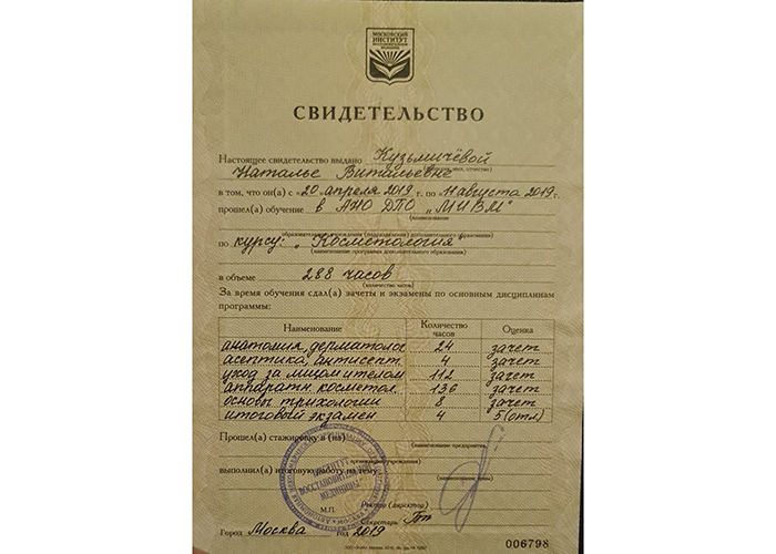 2019 — Московский Институт Восстановительной медицины, специальность «Косметология»