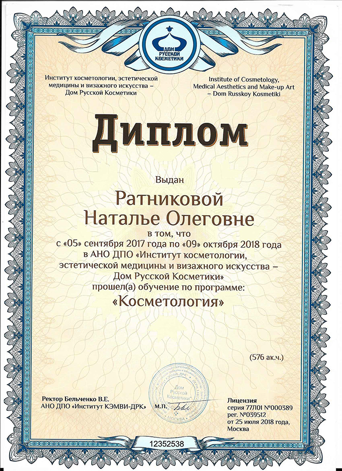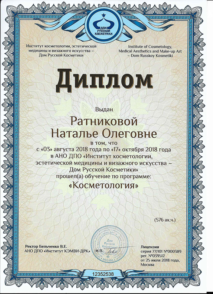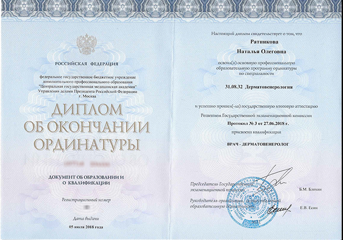 Доктор обладает дипломом медицинского вуза и прошла подготовку по направлениям дерматовенерологии и неврологии, а также владеет дополнительной квалификацией в эстетической медицине и косметологии.