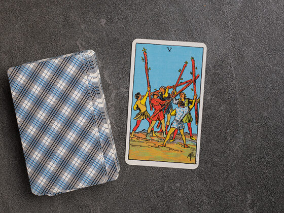 Это карта открытых конфликтов, борьбы, причем нередко с собственными заблуждениями и предрассудками, а также свершений — Пятерка Жезлов Таро