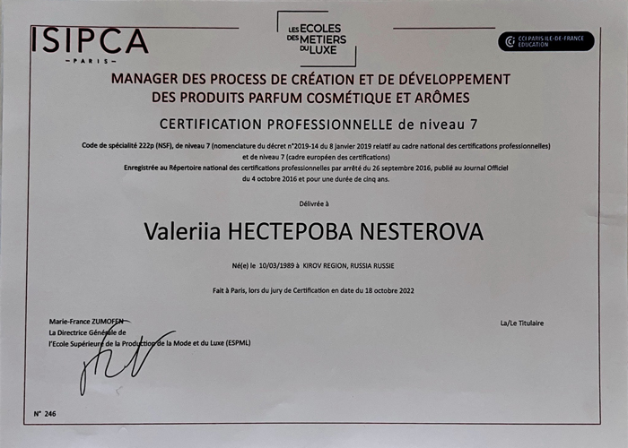 - Диплом по специальности «Экспертиза Парфюмерии» ISIPCA ;