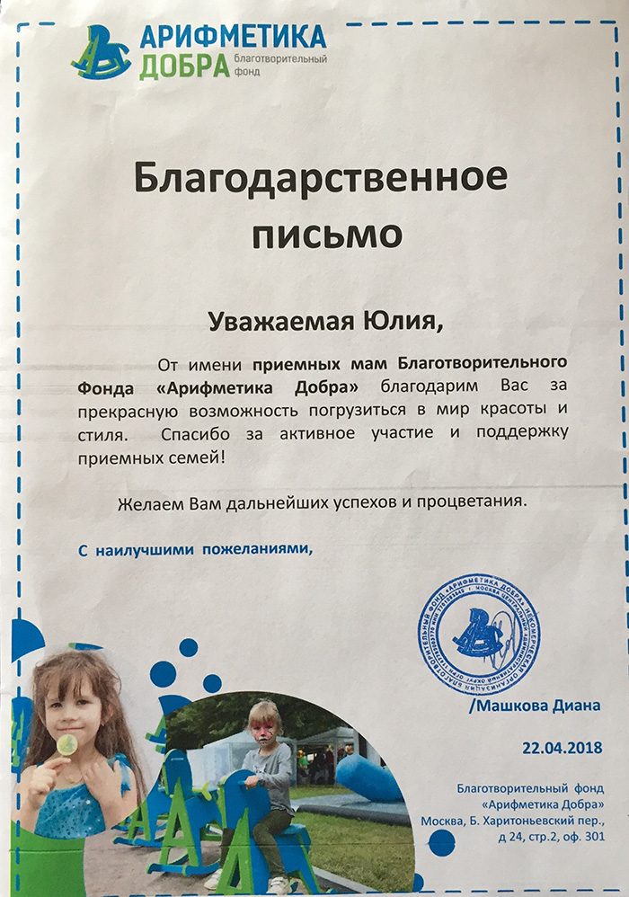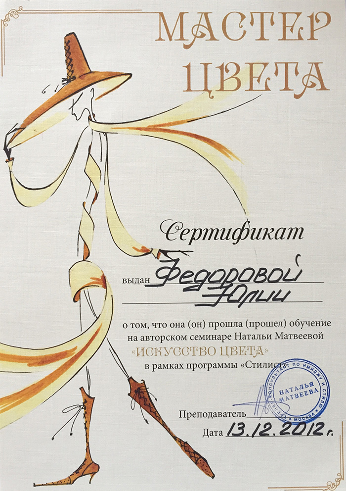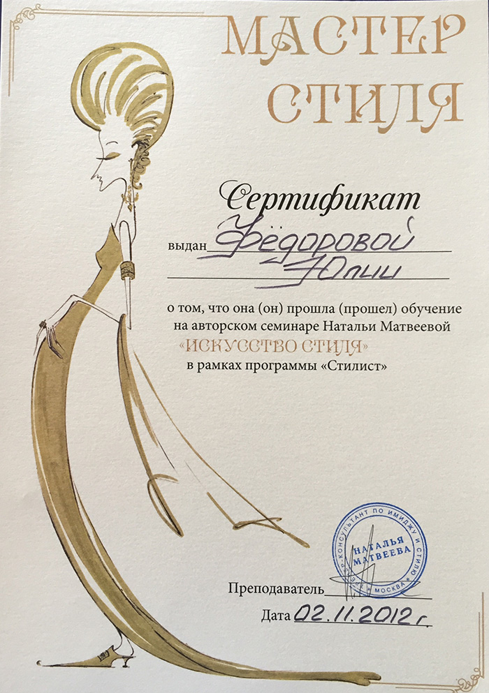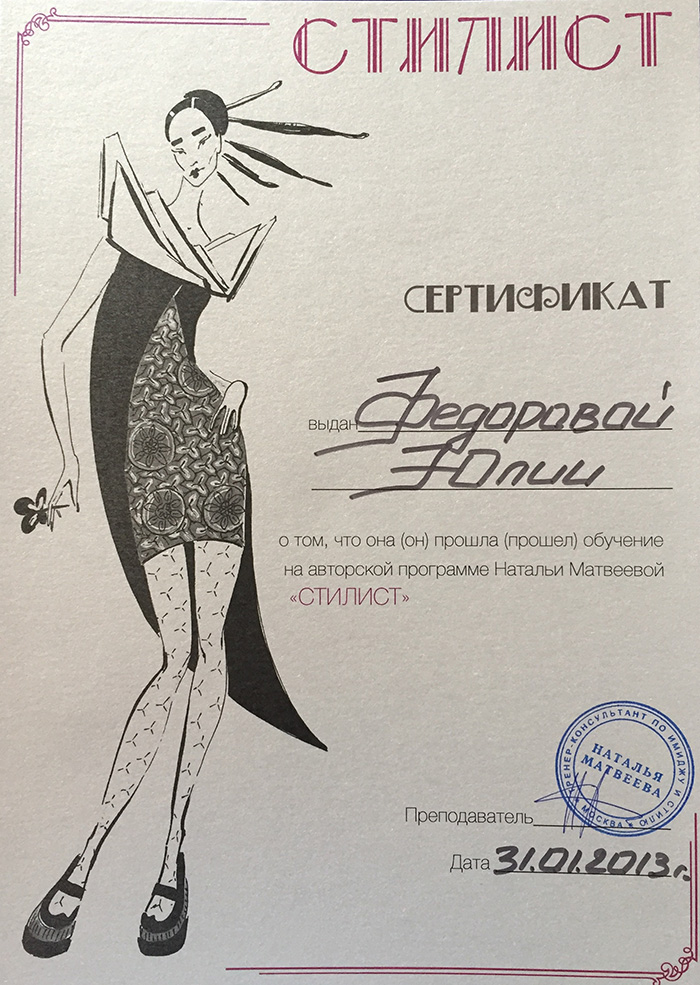 В 2013г. закончила школу имиджа и стиля Натальи Матвеевой.