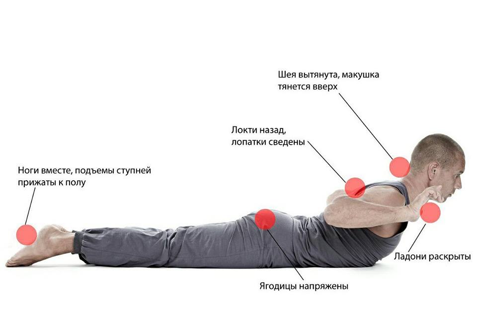 Важно! Не поднимайте голову слишком высоко, шея должна продолжать линию спины. Старайтесь максимально «раскрыть» грудной отдел позвоночника. Не задирайте локти. Подъемы ступней и голени должны быть плотно прижаты к полу.
